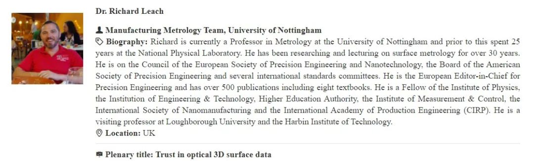△ 诺丁汉大学教授Dr. Richard Leach将作大会报告Trust in Optical 3D Surface Data。Dr. Richard Leach此前在英国国家物理实验室拥有25年科研经验。